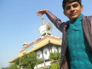 The photo captures Anand Raaz standing alongside his 9th-grade classmates in the serene grounds of Lumbini, the birthplace of Lord Buddha. Anand is dressed casually in a light sweater and jeans, blending comfort with style for the winter trip. His expression is a mix of curiosity and awe as he poses near the iconic Maya Devi Temple, a historic monument surrounded by vibrant prayer flags fluttering gently in the breeze.